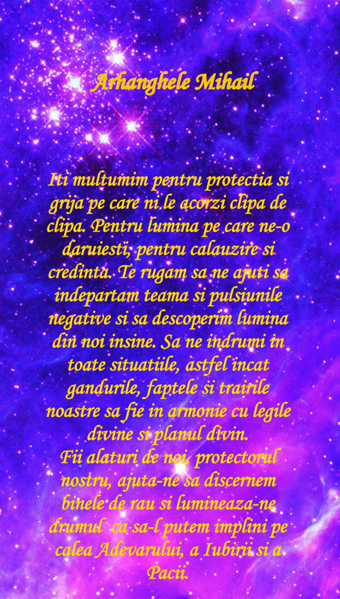 10.719 "ariel, leoaica lui dumnezeu, iti multumesc ca ma invalui in lumina ta aurie. Arhanghele mihail, tu ești căpetenia cetelor îngerești. Multumesc pentru ca ma sprijini in timp ce ma deschid si spun adevarul. Arhanghelul gabriel este cel care ii calauzeste pe parinti in conceperea si nasterea unui copilas,de asemenea. Publicat în noiembrie 8, 2019 de gabriela bogdan. Arhanghelul gabriel este mentionat si in cartea lui enoh unde este numit mesager intre dumnezeu si umanitate. Energia lui este mai mult feminina si lucreaza indeaproape cu arhanghelul mihail a carui energie este mai mult masculina. 07.07.2020 · invocatie catre arhanghelul mihail pentru purificare,eliberare de energia negativa. Ești voievod al puterilor cerești, al heruvimilor, al. Ma bucur de taria si rezistenta ta.